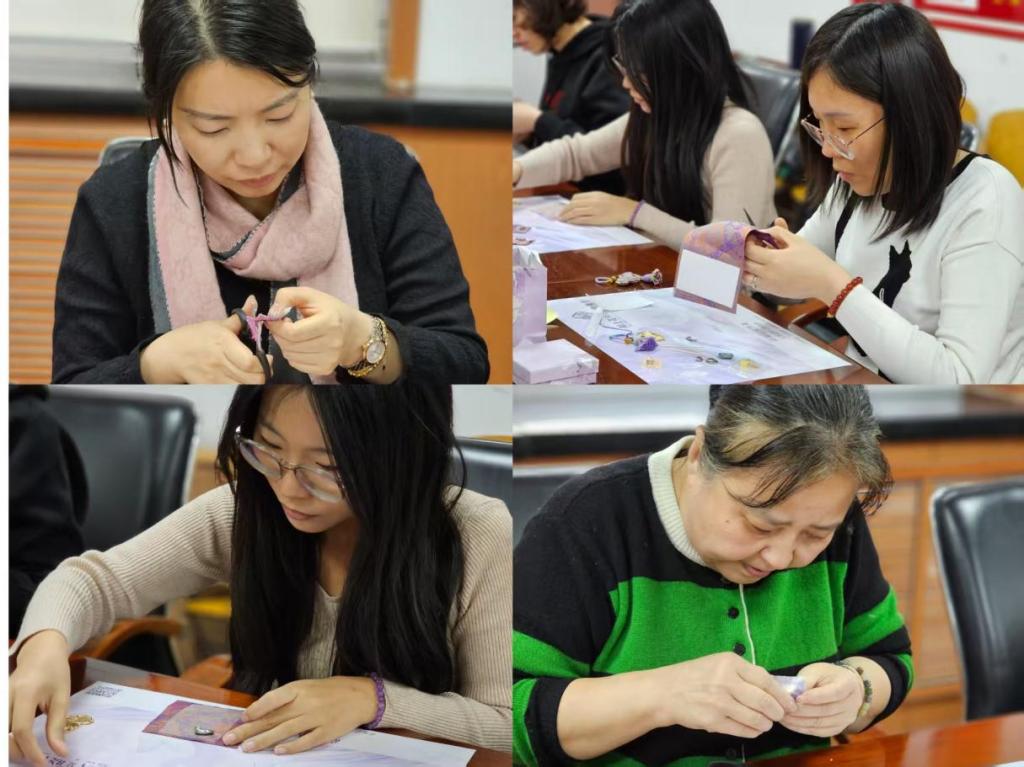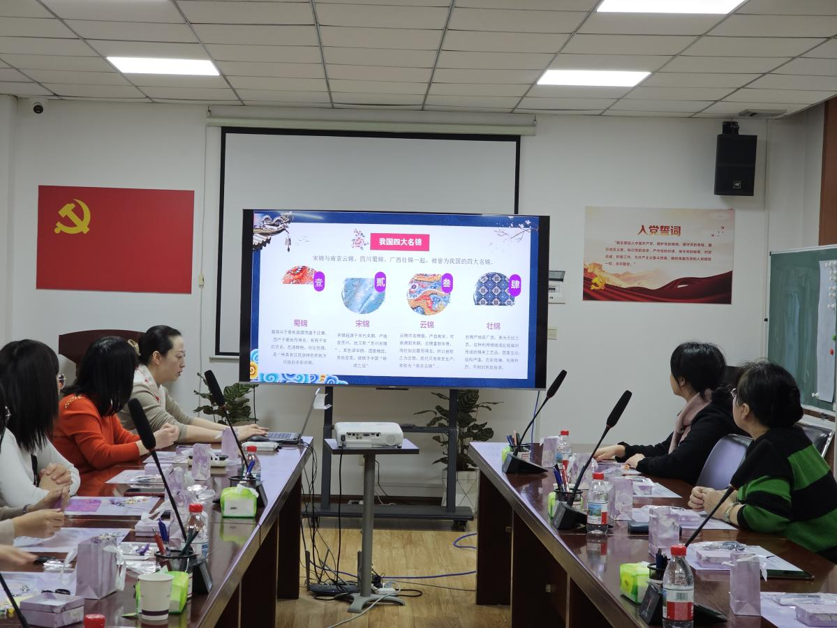 活动开始,工会杨洁老师为大家讲解了宋锦的历史渊源与织造工艺。作为中国传统丝织瑰宝,宋锦色泽华丽、图案精致,被誉为“锦绣之冠”,承载着深厚的传统文化底蕴,引发了老师们的浓厚兴趣。讲解结束后,大家纷纷拿起材料包,投入到手工制作中。裁剪布料、粘贴填充、点缀装饰,大家细致操作,并不时交流技巧,现场气氛温馨热烈。