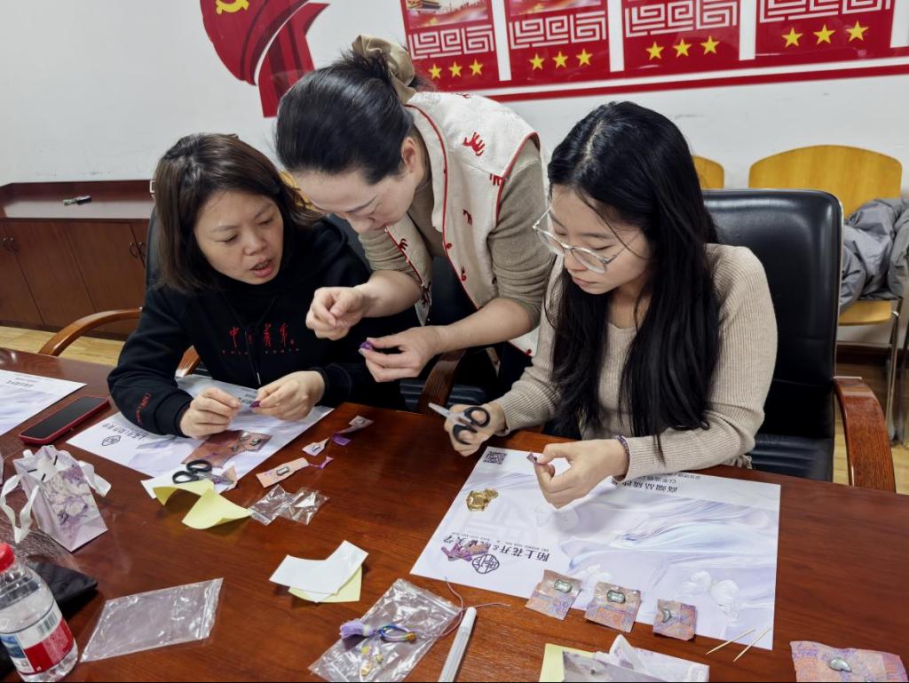 平日里忙碌在岗位上的女教职工,此刻化身为专注的手工艺人,在欢声笑语中,宋锦布料经她们巧手打造,变成了一个个憨态可掬的小马挂饰,看着亲手制作的挂件作品,大家都欣喜地拍照留念。