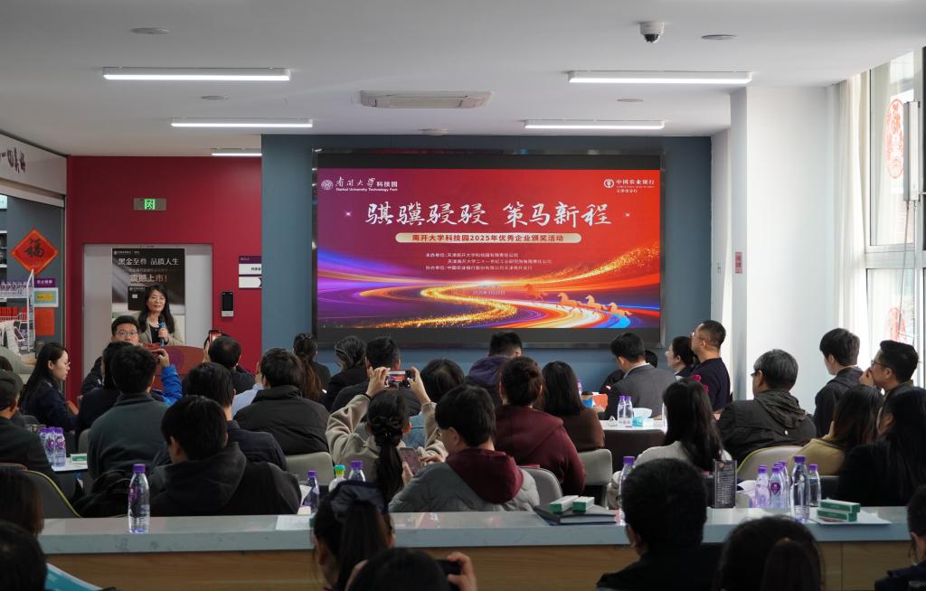 (通讯员 付坤 田博欣 摄影报道)为表彰先进标杆,激发科创活力,推动科技成果转化与产业深度融合,3月20日,南开大学科技园2025年度优秀企业颁奖活动在园区“南大咖”创业智慧空间举办。市科技局园区营商环境处处长王娟,南开大学资产公司党委书记、董事长郭伟,中国农业银行天津南开支行党委书记、行长孙龙,以及南开大学天开园项目遴选工作组成员单位代表、获奖企业代表等齐聚一堂,共同见证优秀企业荣耀时刻,凝聚科创高质量发展合力。活动由南开大学科技园总经理、南开21世纪工研院副总经理高俊芹主持。